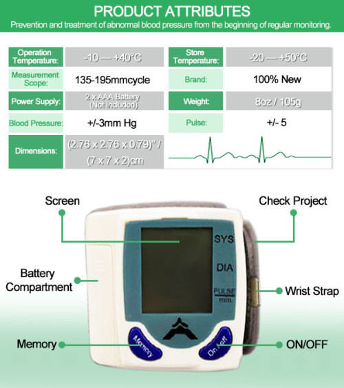 This Digital Arm Cuff Blood Pressure Monitor can be conveniently used at home. It′ s a good tool to keep in touch with your health. Super easy to use and seems to be very accurate. It is also a good present for your parents. Digital Wrist Blood pressure monitor with Memory Function small, portable, easy to use, also this Blood pressure monitor almost for all people own using. With this Blood pressure monitor, you can simply check the blood pressure as a tool for self-popular hypertension.