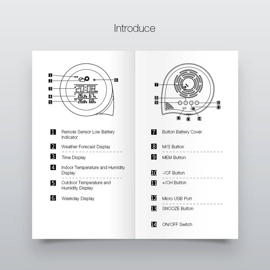 Main Functions | In & Out Hygrometer Thermometer (°C/°F) Max/Min Temperature Humidity Record Calendar (weekday display) Daily Clock with Snooze Function 12/24 Format Hour Time Display ¬トテ/¬トノ Switch Over Weather Forecast Remote Sensor Battery Low Indicator |