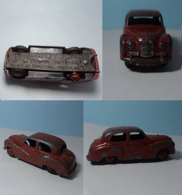 Red body and hubs, large baseplate lettering, Austin Somerset cast into underside of roof, play-worn condition, missing one tire.