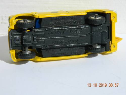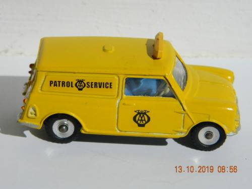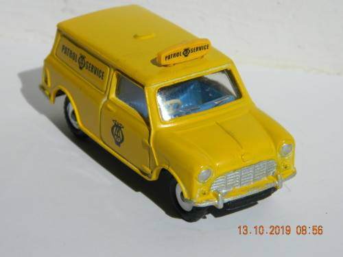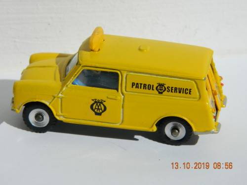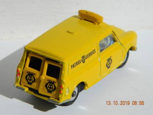 DINKY TOYS - 274 - MINI MINOR VAN ' A.A.' .................................................. MADE IN ENGLAND BY MECCANO DURING 1964 - 1973 .................. YELLOW BODY, BLUE INTERIOR, CLEAR GLASS WINDOWS, OPENING BACK DOORS, SPRING SUSPENSION.............................. THIS TOY VAN HAS BEEN REBUILT................ PLEASE SEE THE PHOTOS .............................................