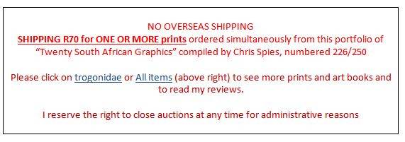 Print No. 226/250 From a portfolio of « Twenty South African Graphics » compiled by Chris Spies [1979/80?] Signed and numbered by the artist | DIRK MEERKOTTER SIGNED PRINT UNFRAMED Sheet size: 43 x 30 cm Good Condition Please see images. |
