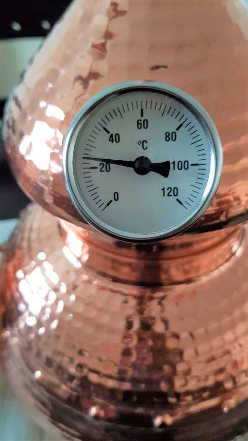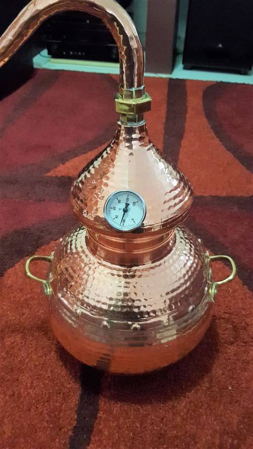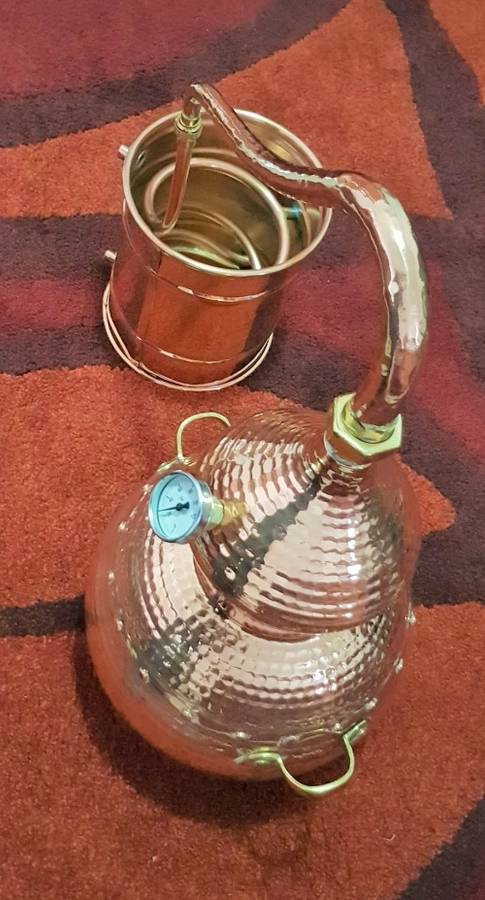 Typically, the distillery / alembic consists of a boiler, with variable capacity, which is placed on a capacitor helmet extending in a cooling tube to the condenser in the form of a copper coil, housed in a deposit, which will be introduced the coolant, with exit to the distillate. The deposit usually fills up with cold water normally circulating in the opposite direction to the distillation coil. At the exit orifice there is usually a device for placing the alcoholometer to provide the degree of output control, and separate the various stages of distillation.