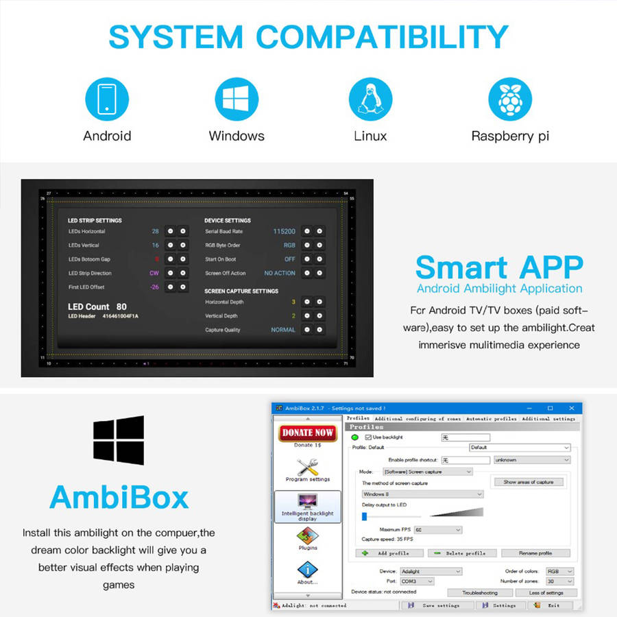 * Adds ambient backlight effects to Computer or laptop compliment on-screen video content.