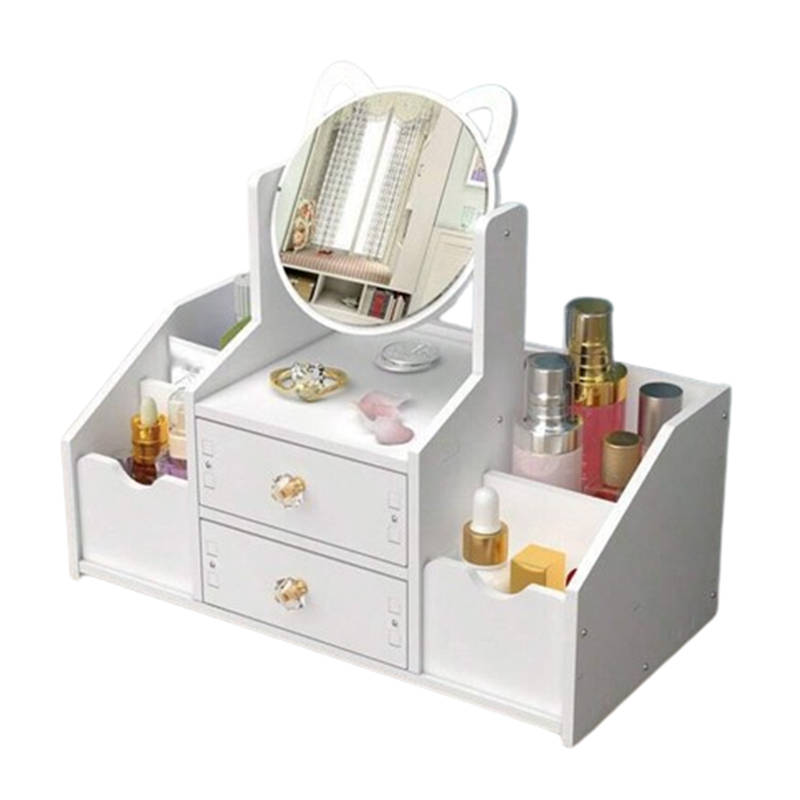 - Our makeup mirror storage display stand has multiple compartments and drawers.