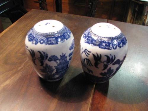 DM84Sale STUNNING VINTAGE CHINESE TYPE DESIGN SALT AND PEPPER SET. BLUE AND WHITE VINTAGE SET WITH AN S ON THE SALT AND A P ON THE PEPPER @@@ Crazy Low R1 Start