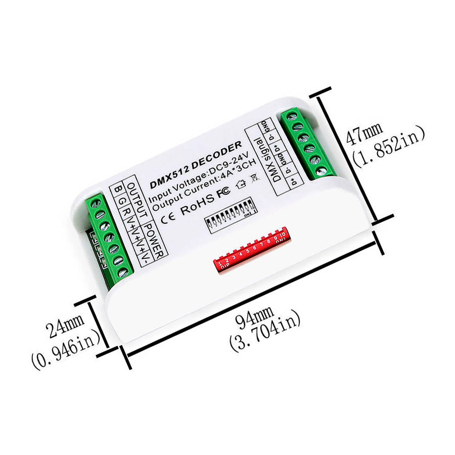 Features: It used advanced microelectronic control technology. Mini models, in line with international standards. Suitable for advertising modules, light bars, bars. Widely used in a variety of dimmable lamps. This constant decoder is used when DMX512 control equipment control general LED lighting. Specification: Type: RGB 3 channels, RGBW 4 channels Input voltage: DC9-24V Output current: 4A Maximum power load: 144W(12V), 288w(24V) Output gray level: 256 Shell material: plastic Size(approx): 93*45*23 mm(L*W*H) Package included:? 1 x LED decoder