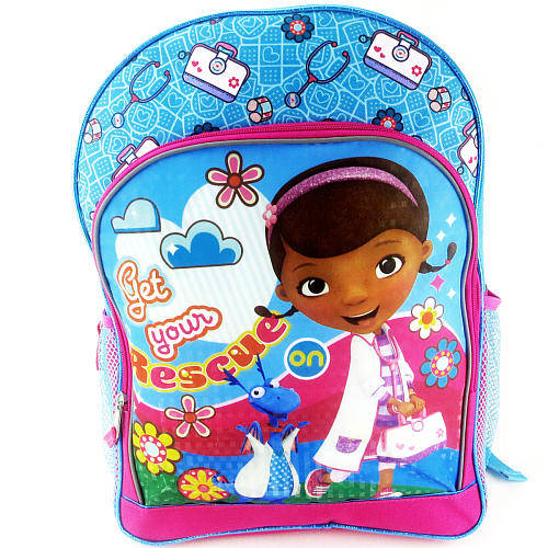 Product DescriptionDoc McStuffins backpack. Adjustable shoulder straps are reflective/padded for carrying comfort. Zipper closure, features one main compartment, one front compartment with reflective piping and two side air mesh pockets. Contains small hang loop for locker.The Doc McStuffins Dottie and Stuffy "Get Your Rescue On" Backpack with Two Side Mesh Pockets Features:Reflective StripsSide Mesh PocketsThe doctor is in! Doc McStuffins can fix your toys with a little help from her friends Stuffy, Hallie, Lambie and Chilly. You can find Doc McStuffins toys, accessories and games right here at Toys R Us.Reflective Strips Side Mesh Pockets