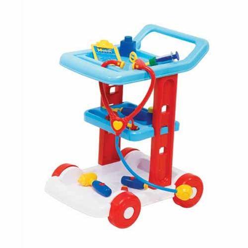 Is there a doctor in the house? Your child can put on scrubs and wheel this medical cart to take care of patients. The rolling cart ha swivel shelves and comes complete with all the essentials a doctor needs including 12 medical tools, a stethoscope, blood pressure wrap and an IV drip.