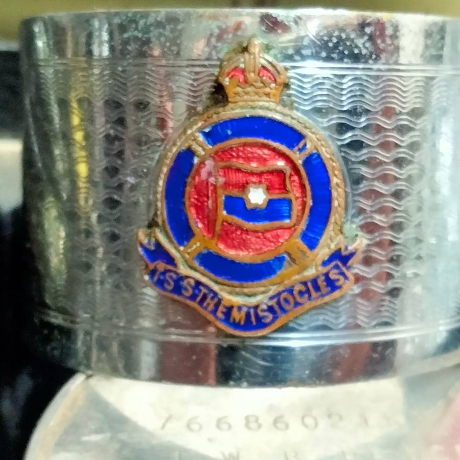 +* 1 Serviette ring Enameled badge T S S. THEMISTOCLES engine turned plated did military service