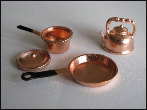 A doll house miniature set of 2 copper cooking pans and a pot.