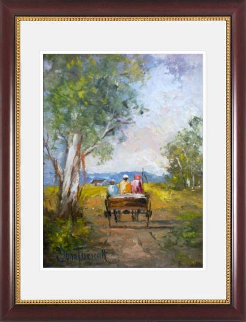 Donkey cart scene partly painted with a palette knife for a thick raised effect. Unframed, 15 x 20cm on canvass board.