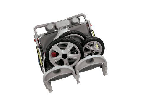 Take a stroll or even a jog with babies in the InStep Safari Double Jogging Stroller. Made for the active parent, this swivel wheel stroller provides features that keep the little one comfortable such as pneumatic, high performance tires that ensure a smooth ride, a dual trigger folding mechanism and built-in carrying handles for uncompromising safety when folding and transporting the stroller. Parent and pivoting child trays with two cup holders each add convenience and all three wheels come with a quick-release feature that make removal a snap (literally). The canopy is retractable and has five positions to ensure protection against UV rays. This stroller seats two children up to 50 pounds each.