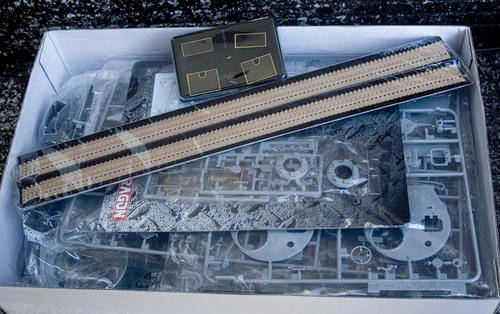 A great kit allowing one of three options to be built. Kit has photo etch parts and many features like recoiling barrel, hatches with interior detail, MG with sights and ammo bag, movable driver's vision ports, stowage bins open or closed option with padlocks, workable torsion bars, and many more. This is a great kit of this tank and one of the more accurate kit of the Tiger. Content factory sealed and box in good condition.