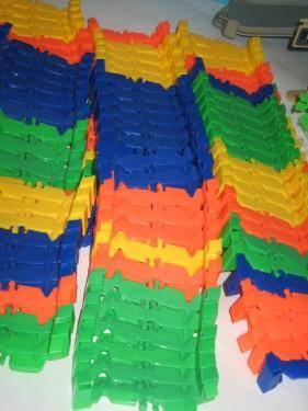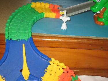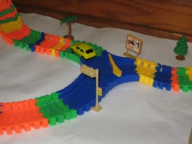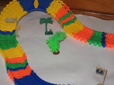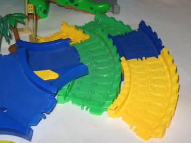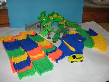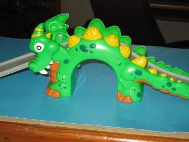 Interlocking tracks with various accessories. If one inserts batteries (not included) into the Dragon, it makes sounds and some light go on and off. Battery cover not there.