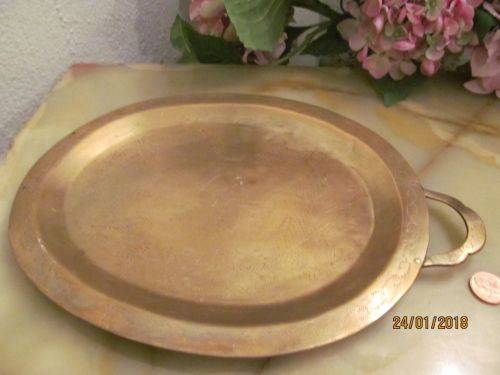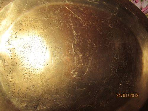 AN ITEM WHICH CAN BE UTILIZED AS A MAGNIFICENT BRASS TRAY UPON WHICH TO DISPLAY OTHER ITEMS OR PURELY IN A DECORATIVE ROLE ON ITS OWN. THE TRAY IS OVAL SHAPED AND HAS A BRASS HANDLE ATTACHED ON ONE SIDE. THE SURFACE OF THE TRAY HAS BEEN HAND ETCHED IN A DETAILED LANDSCAPE SCENE WITH TWO CHINESE MEN SEATED SIDE BY SIDE INSIDE A SMALL TEMPLE AREA. AROUND THEM IS A PANORAMA OF LEAVES, TREES AND VEGETATION AND PROMINENT IN THE LANDSCAPE IS A PAIR OF LARGE FEROCIOUS LOOKING DRAGONS ONE ON EACH SIDE OF THE TRAY COMPLETE WITH SCALES ETC