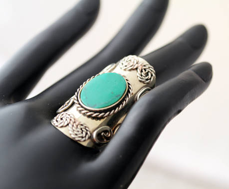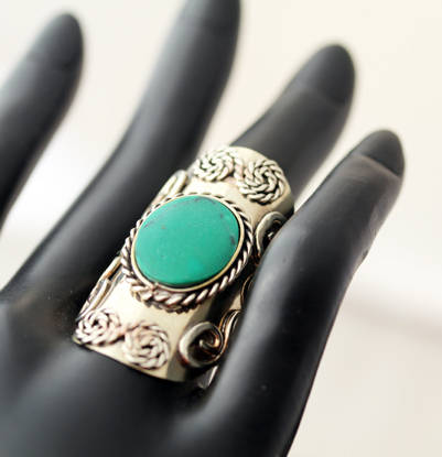 A Bohemian statement piece, this large ring features an unusual gemstone - a green Aventurine, a glorious greenish turquoise colour, opaque, with darkish inclusions. Aventurine takes its name from the Italian word 'a ventura', a type of glass discovered at the beginning of the 18th century, named because of the microscopic particles of mica within the stone. The softly domed cabochon is bezel set in a very long (39mm!) alpaca silver cylindrical ring head. 3-D embellishments add interest and texture to the piece in the form of twisted rope designs forming the border of the gemstone as well as four flat coiled rope details, two above and 2 below the gemstone. The shank has been creatively designed with a wire band running from both sides, under the finger and doubling back on itself before reaching the other side, creating a shank that is adjustable. Where the wires join the ring head, they splay out at almost 90 degrees, sitting on top of the smoothly polished silver, running nearly the length of the head and ending in a swirl on either side. The heavy, 7,07 gram ring sits snugly and smoothly on the finger, a bonus being the adjustability of the shank. Its a vintage piece and shows a few minor scuff marks. Also the aventurine gemstone is not 100% evenly set into the frame. One side sits 1mm higher than the other. Please note, this is not sterling silver! It is alpaca (also known as 'alpaca'), which is an alloy consisting of copper, zinc, nickel and tin. Flamboyant and very Bohemian, this is a large and unusual piece.