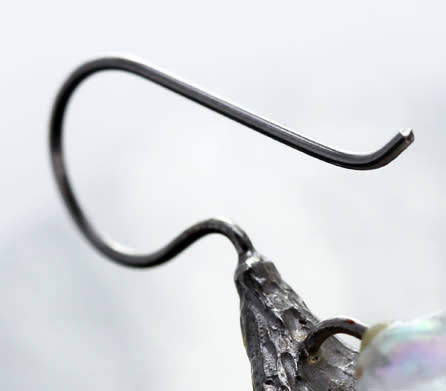 These stunning large earrings feature an almost flat Baroque pearl, very organic in shape, lustrous and creamy, teamed with solid sterling silver leaves, textured with a grooved, organic finish and bordered with a golden hue on the edges of the leaves, providing a contrast and defining the shape. Attached to a long solid sterling silver hook, these dangly earrings measure 45mm long x 25mm wide. They weigh 20,71 grams together. They are handcrafted and defintely large but with the interestingly shaped natural Baroque pearl fairly flat, they hang well. A most interesting and very gorgeous piece of organic, natural jewellery.