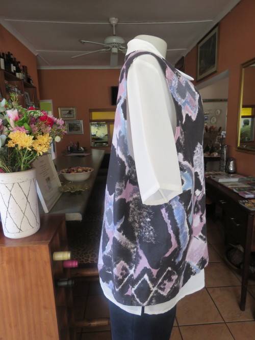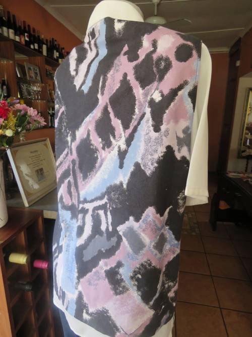 Dramatic patterned long loose hanging waistcoat.Size 44/20 in 100% cotton.Owner made.Close with 4 buttons on front.V neck.Black,violet,grey an light blue pattern.New cond.