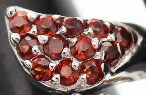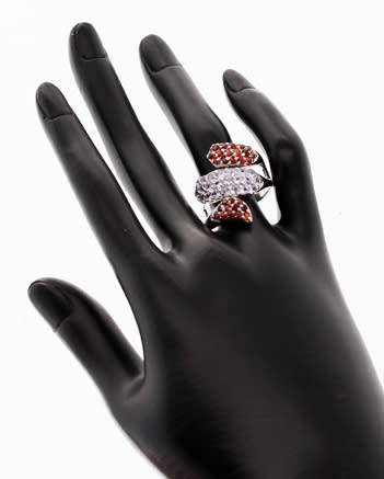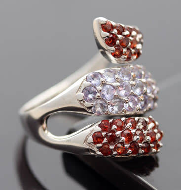 This eye-catching and dramatic piece features three organic crossover elements with openwork between the elements. The ring itself is chunky, crafted in sterling silver, and weighing a hefty 7,81 grams. The top and bottom elements are studded with rich, red, round-cut natural Mozambique-mined garnets, and the middle element elements is studded with lilac blue round cut tanzanites, all claw set in sterling silver. The colour contrast between the pale blue sparkle of the tanzanites and lush, ripe berry red of the garnets is strong. It's a big ring, stretching 25 mm up the finger and 21 mm across. It sits 8mm above the finger. A ring with fabulous attitude and all natural gemstones!