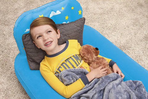 It projects a starry night sky with multi-color alternating lights, creating a magical and tranquil environment that will help your child fall asleep. The air bed has an inflatable backrest that offers extra comfort while sitting.
