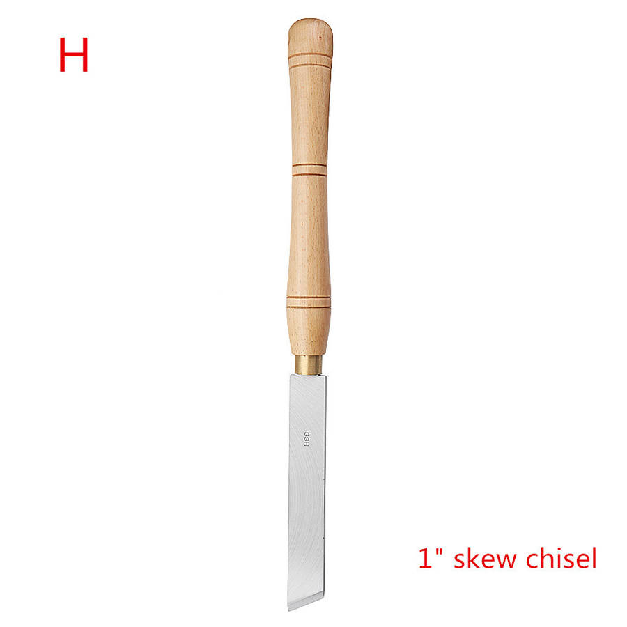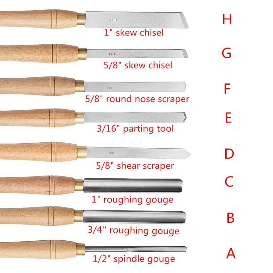 Type | A= 1/2" spindle gouge B= 3/4'' roughing gouge C= 1" roughing gouge D= 5/8" shear scrape E= 5/8" round nose scraper F= 3/4'' roughing gouge G= 5/8"skew chisel H= 1" skew chisel |