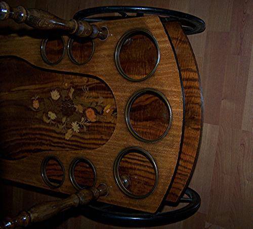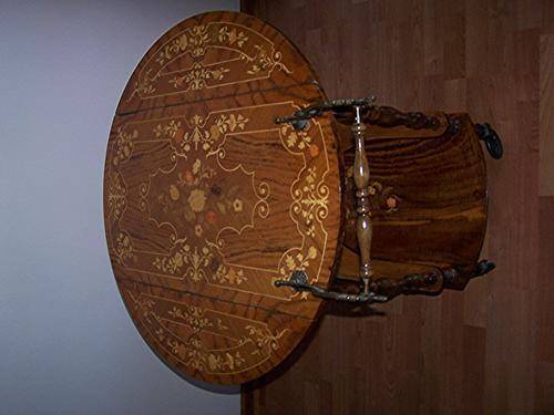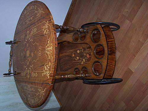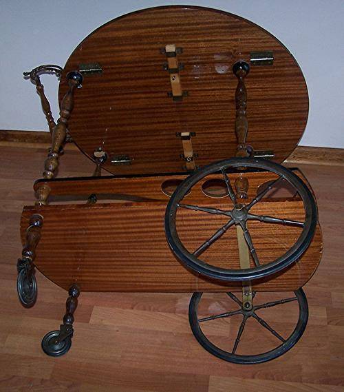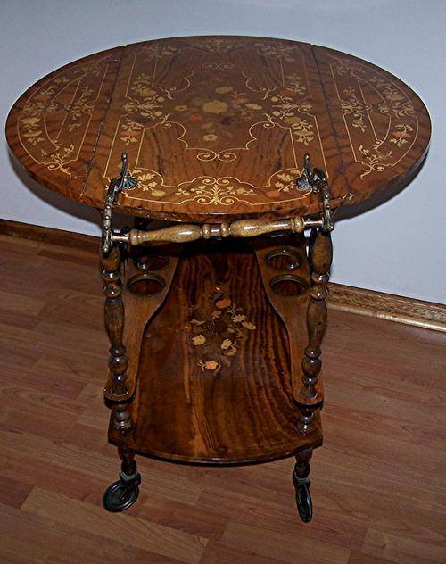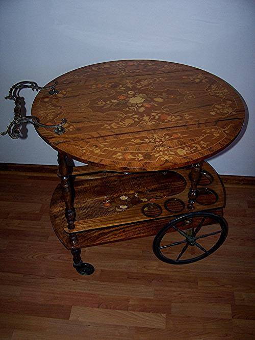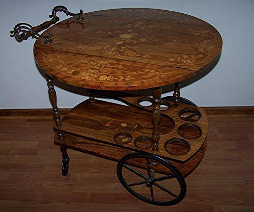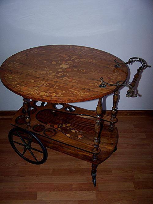 Condition: inlaid marquetry condition excellent but please note some damage to protective layer of varnish. Handle slightly misaligned. The overall condition of this beautiful trolley is good.