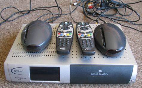 It comes with 2 remotes, 1 TV room receiver, 1 bedroom transmitter, cabels and handboek.