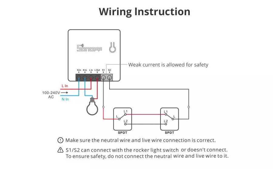 The Sonoff MINI R2 / Dual Sonoff R2, as a reinforced MINI two-way DIY smart Wifi switch with External Switch Control, has been redesigned to improve safety and performance to an optimal level. The MINI R2's antenna is hidden totally into the interior that ensures you peace of mind when using this device. Additionally, the S1 and S2 interfaces are colored gray in order to distinguish them from the other high current input and output interfaces. This helps to remind you not to connect live or neutral to any of the S1 or S2 interfaces.