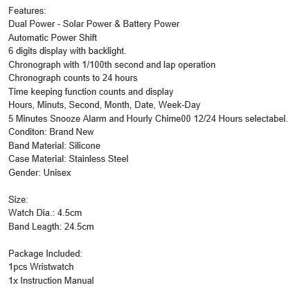 Dual Solar and Battery Power Chronograph, Water and Shock Resistant Sport Wrist Watch
