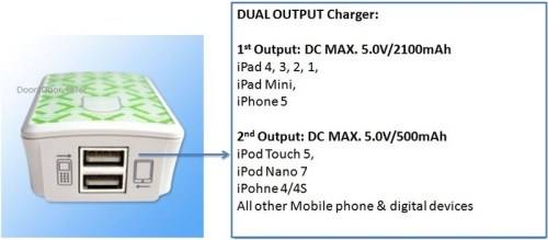 - Dual USB Output (both ports used at the same time): DC Max. output 5.0V/1600mA (for iPad, iPhone 5, iPad Mini) + DC Max. output 5.0V/500mA (iPhone 4, iPod Nano 7, iPod Touch 5 and other Mobile Phone & digital devices)