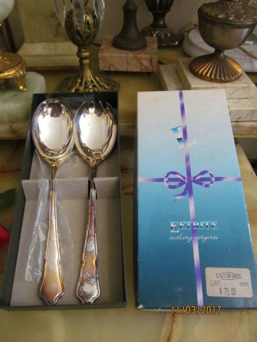 This FABULOUS silver plated set of Salad Servers is manufactured by Eetrite and distributed through the Suttafords chain. The set consists of a Spoon and Fork for serving and preparing Salads and each one is beautifully designed with the DUBARRY pattern. The set is Boxed in the ORIGINAL Box with wrappings