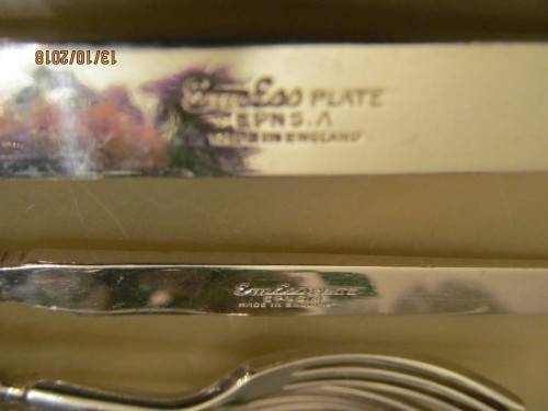 1)- FOUR (4) DESSERT KNIVES. ALL FOUR ARE IN PERFECT CONDITION WITH NO PATINA, RUST, DAMAGES OR BENT. ITEMS ARE EACH BLADE STAMPED - "EMESS PLATE, EPNS A, MADE IN ENGLAND" EACH IS 17cm LENGTH.....1.2cm WIDTH OF BLADE.....1.5cm WIDTH OF HANDLE TOP