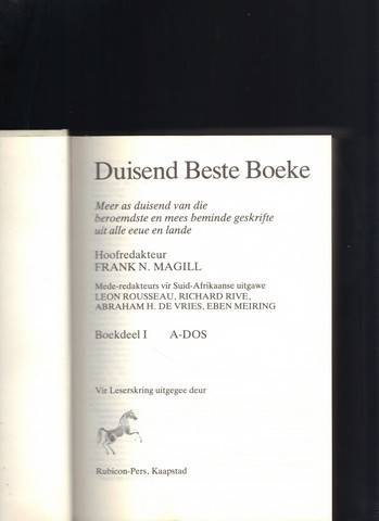 Duisende Beste Boeke, Hoofredakteur Frank N. MaGill in medewerking van Leon Rousseau, Rubicon-Pers 1983, kompleet 4 dele, naam van vorige eienaar, harde bande in goeie toestand.