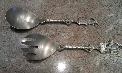 Up for auction is a Dutch theme salad spoon and fork set. The windmill blades rotate.
