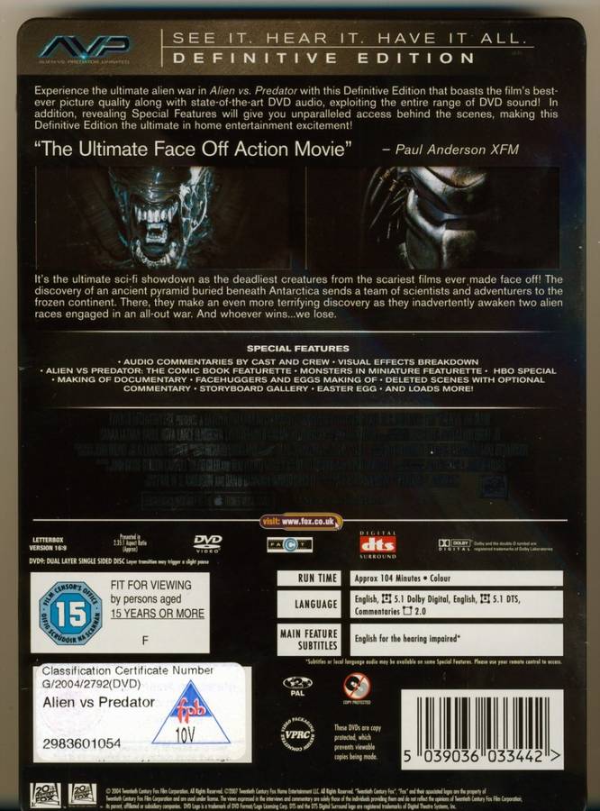 DVD - Alien vs Predator Unrated Definitive Edition Steelbook 2 Disc