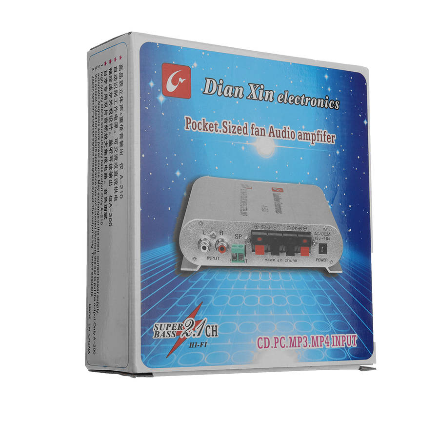 Description: Model: DX-210 Material: Aluminum Voltage: 12V-15V Power: 40W + 40W Subwoofer Power: 50W AUX: 3.5mm Channel: 2.1 Chip type: TDA8946/ 8201 Output Impedance: 4 - 8 Size(L x W x H): Approx. 14 x 10.5 x 4cm / 5.51 x 4.13 x 1.57 inch Connect with mobile phones, computers, MP3, MP4 and DVD players Mini car amplifier, save your car room and easy to operate Mega bass part and volume control, offer you sensational music All-aluminum and sand-blasting shell, not easy to be broken Low consumption and excellent thermal stability