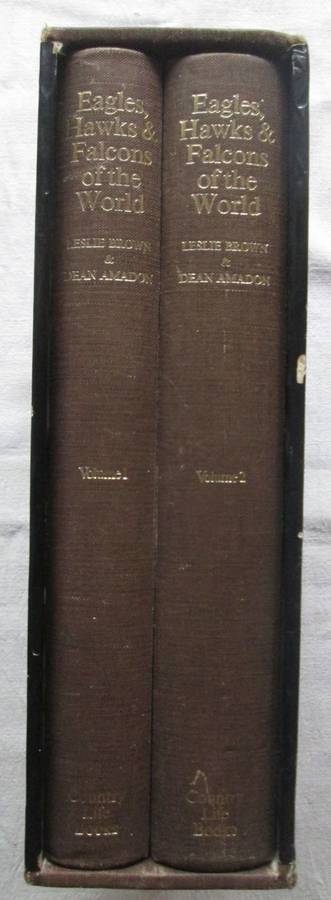 A detailed two volume-work on diurnal birds of prey. A Mammoth work by Leslie Brown and Dean Amadon, published by Country Life, 1968. Beautifully illustrated throughout. Slipcase shows wear but this has kept the board in good condition. Heavy set- tracked postage is R75.00.