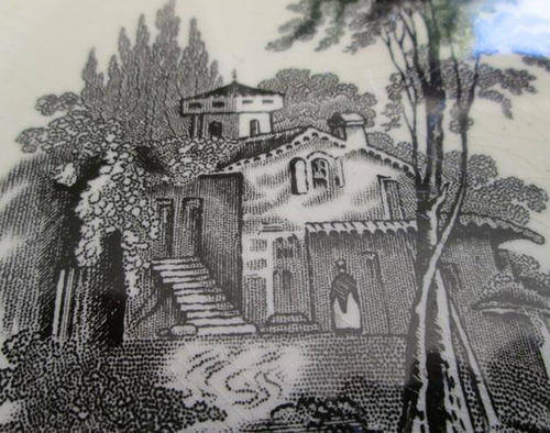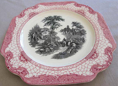 EARLY AND STUNNING, 1900s "LANDSCAPE" BLACK AND PINK TRANSFER DESIGN, DINNER PLATE MADE IN ENGLAND, THE CONDITION IS VERY GOOD WITH NO CHIPS OR HAIRLINE CRACKS, THERE IS MINOR AGE RELATED CRAZING . SIZE DIA 22.5cm.
