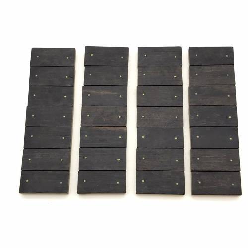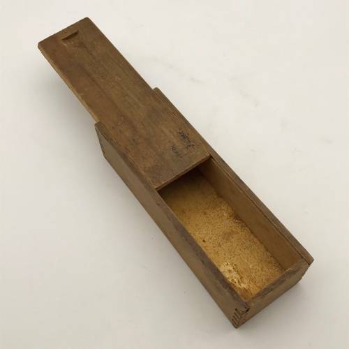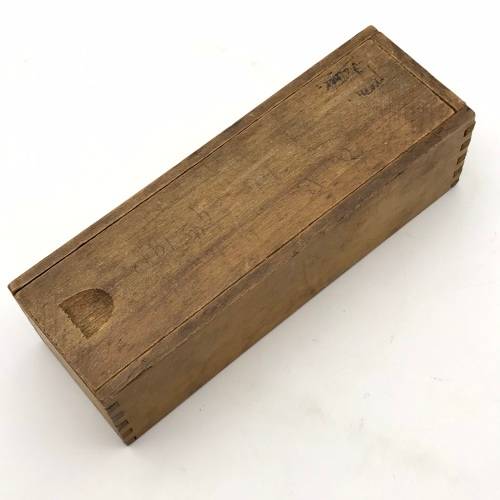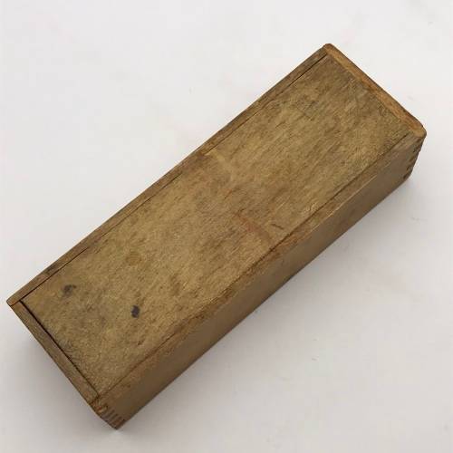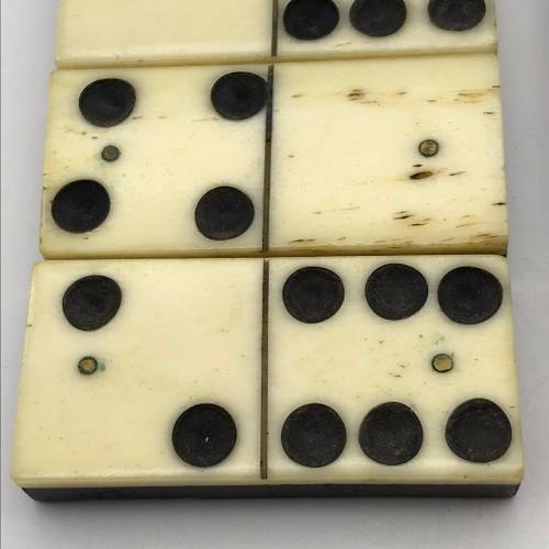 This old, collectable, boxed set of dominoes comes in its original, very well-made wooden box with 'tongue in groove' joints and a slide open lid. It consists of twenty eight hand-made domino pieces, that appear to be made from ebony and bone with small brass pins. The set is complete and all, including the box, are in great condition. The box measures17,5cm x 6cm x 5cm and together with the pieces weighs 435g.