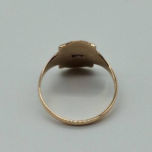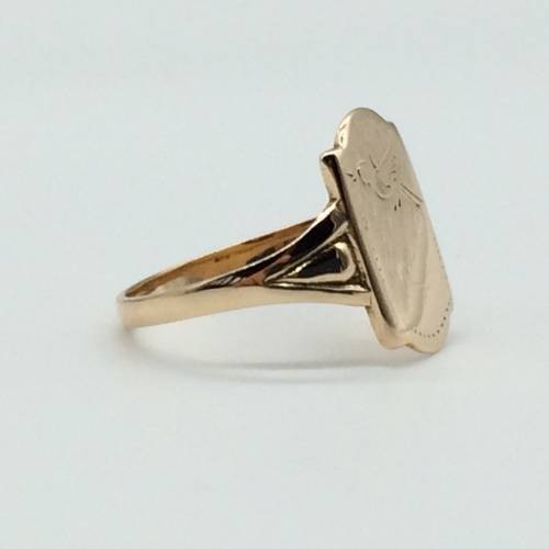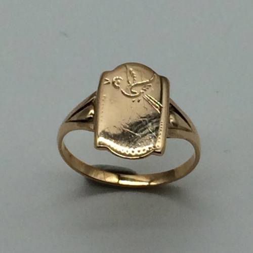This lovely, little, antique, rose gold signet ring is decorated with an engraving of a small, flying bird above a plain panel. It is stamped '9ct', is in excellent condition and weighs 1.3g.