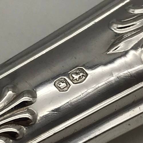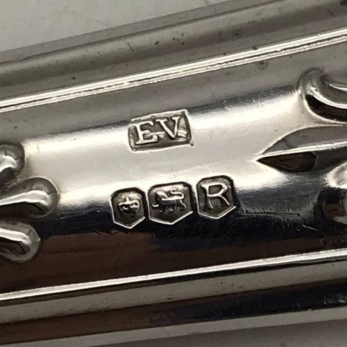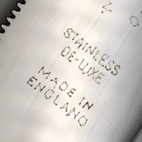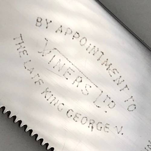 This early, good quality cake knife has a sterling silver handle, decorated in the ever popular 'Queens' pattern. The handle is English hallmarked for Sheffield 1959 and stamped 'E.V' for silversmiths 'Viners Ltd' (Emile Viner), and the blade is etched 'VINERS LTD' 'BY APPOINTMENT TO THE LATE KING GEORGE V' 'MADE IN ENGLAND' and 'STAINLESS DELUXE'. The cake knife is in good condition and measures 26cm in length, with a weight of 59,6g.