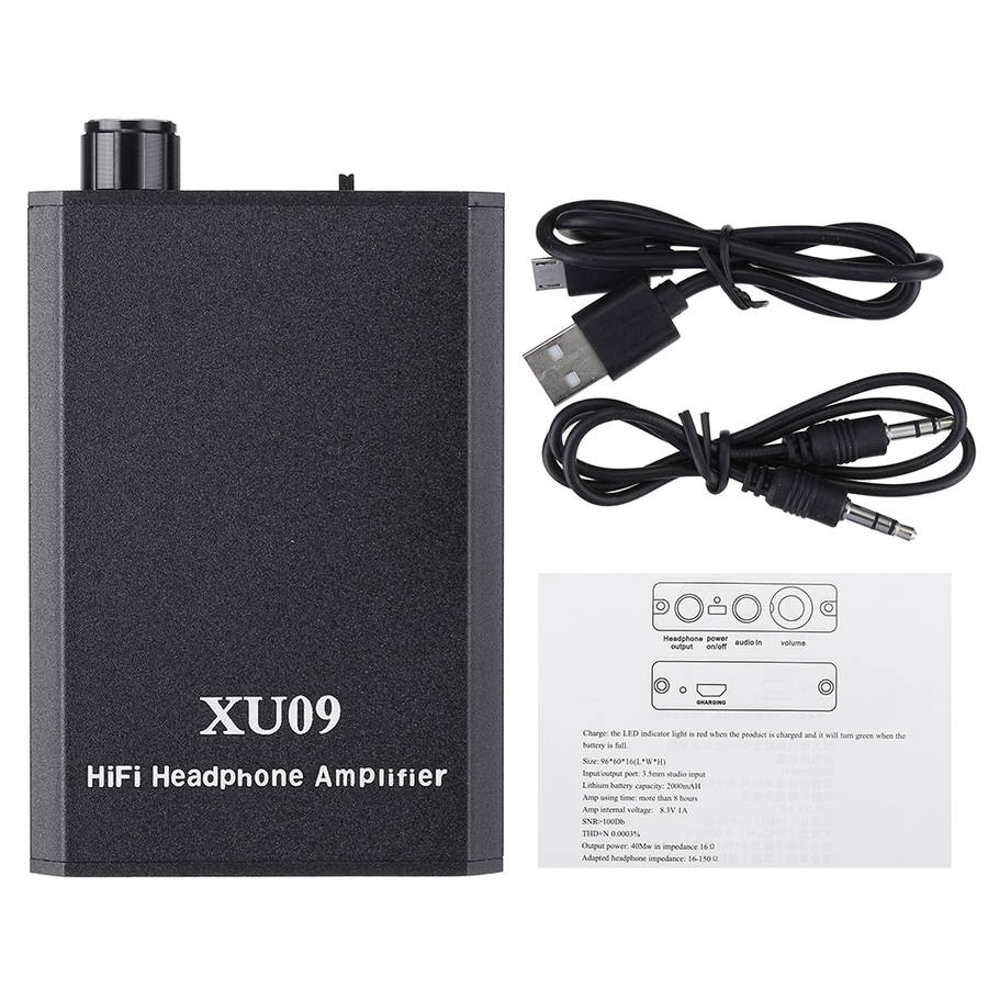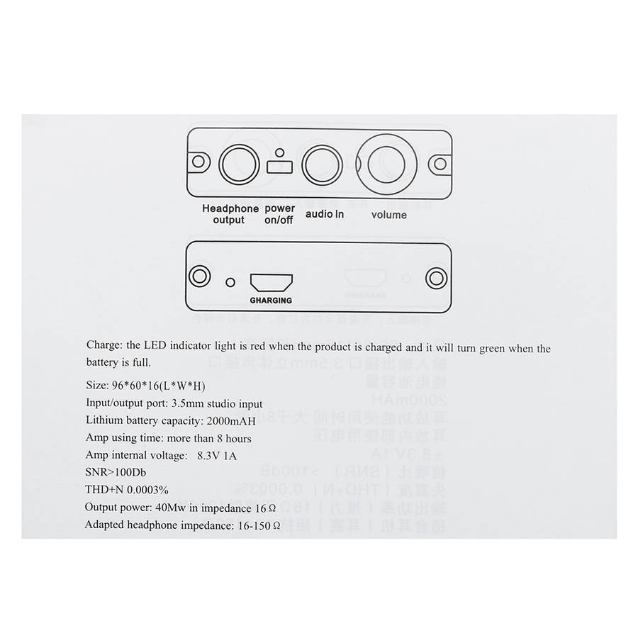 Feature: Model: XU09 Output Power: 40mW(32load) Type: Mini Amplifier Package: Yes Output Type: 3.5mm Input Type: 3.5mm Output Power: 40mW(16load) Sampling Frequency Supported: USB Suitable Headphone impedance: 16 to 150 Battery Life: 8H (USB IN) Battery: Built-in 2000mAh rechargeable lithium polymer battery. Suitable OS: Universal Charge Port: Micro USB port. Internal use voltage: minus/ plus 8.3V, 1A SNR: greater than 1000dB THD+ N: 0.0003% Weight: 200g Dimension: 97*60*15 mm(L*W*H) Package Included: 1 x Rechargeable Headphone Amplifier Note: Due to the difference between different monitors, the picture may not reflect the actual color of the item. According to different conditions, Battery capacity can be divided into actual capacity, theoretical capacity, also called rated capacity. Battery capacity refers to the battery storage capacity. The unit is ``mAh``, 1Ah = 1000mAh, so there are some differences between rated capacity and actual capacity in Li-ion Battery. It is normal and reasonable.