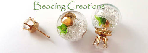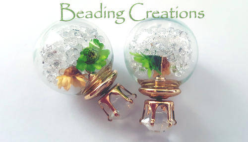 EARRINGS - CLEAR GLASS BALL DOUBLE SIDED STUD - DRIED FLOWERS AND CRYSTALS GREEN AND YELLOW