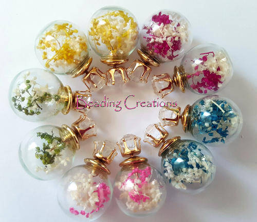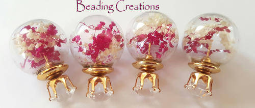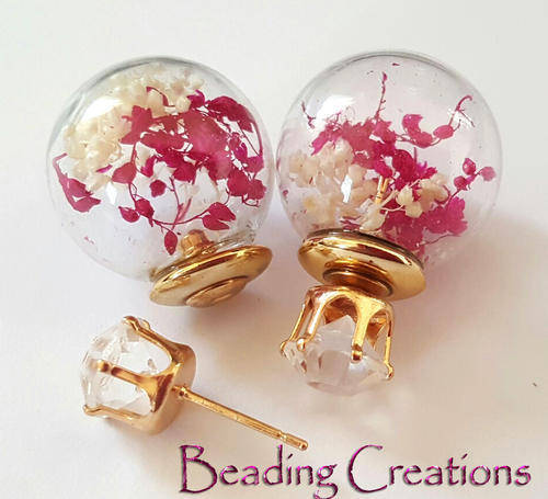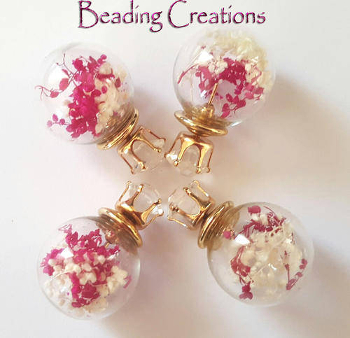 EARRINGS - CLEAR GLASS BALL DOUBLE SIDED STUD - DRIED FLOWERS CERISE PINK AND WHITE