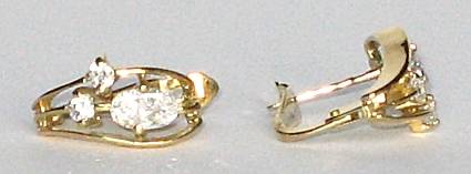 A pair of earrings, each featuring 1x marquise-cut & 2x round brilliant-cut simulated diamonds = cubic zirconia.