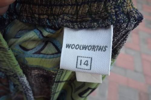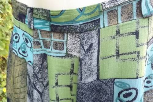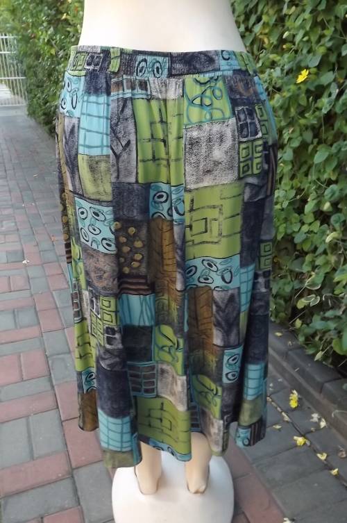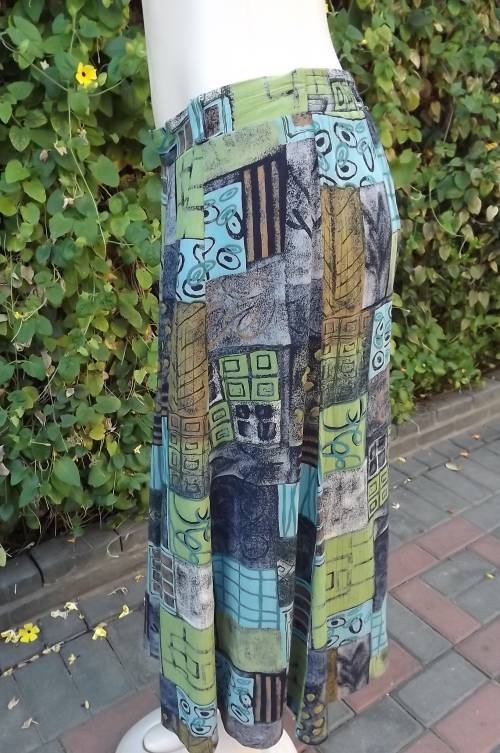 Easy to wear paneled A line skirt in blocked patterns size 38/14 by Woolworths. Green ,blue and brown colours. Elasticated middle back.Viscose/polyester blend fabric.As new.