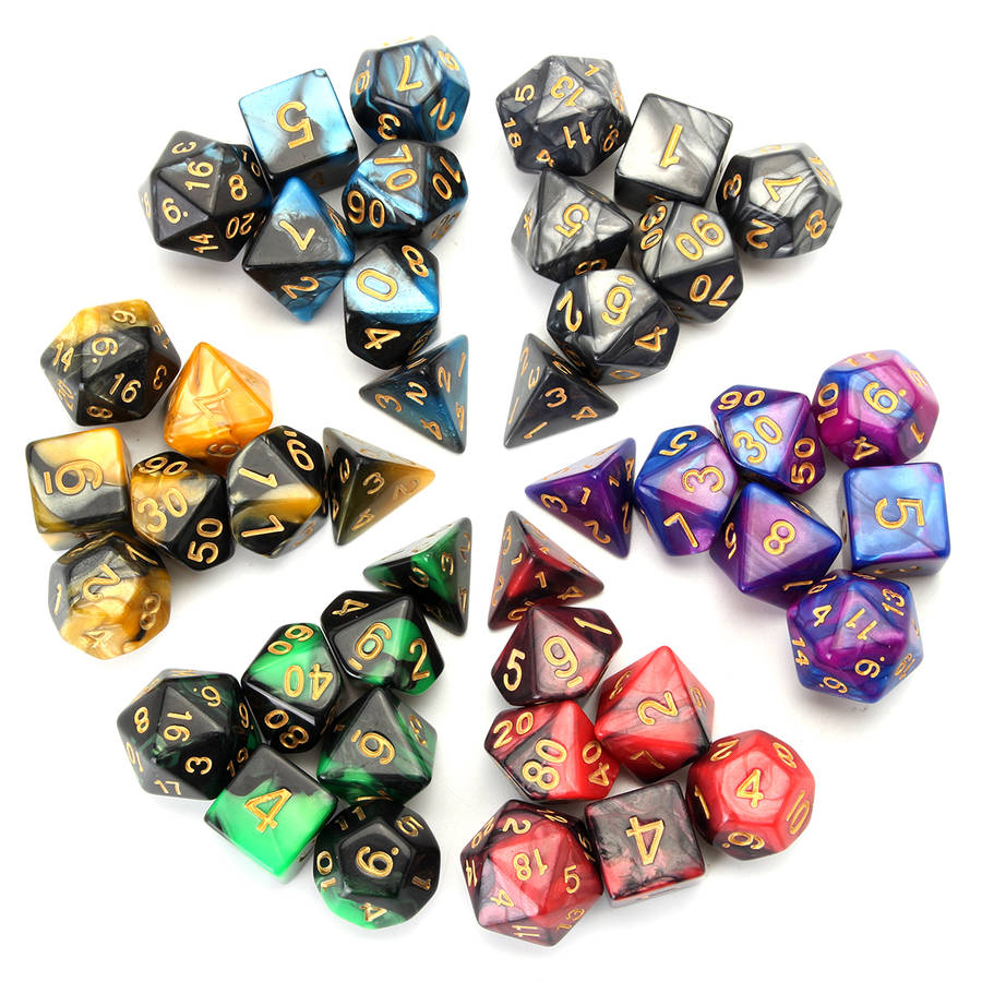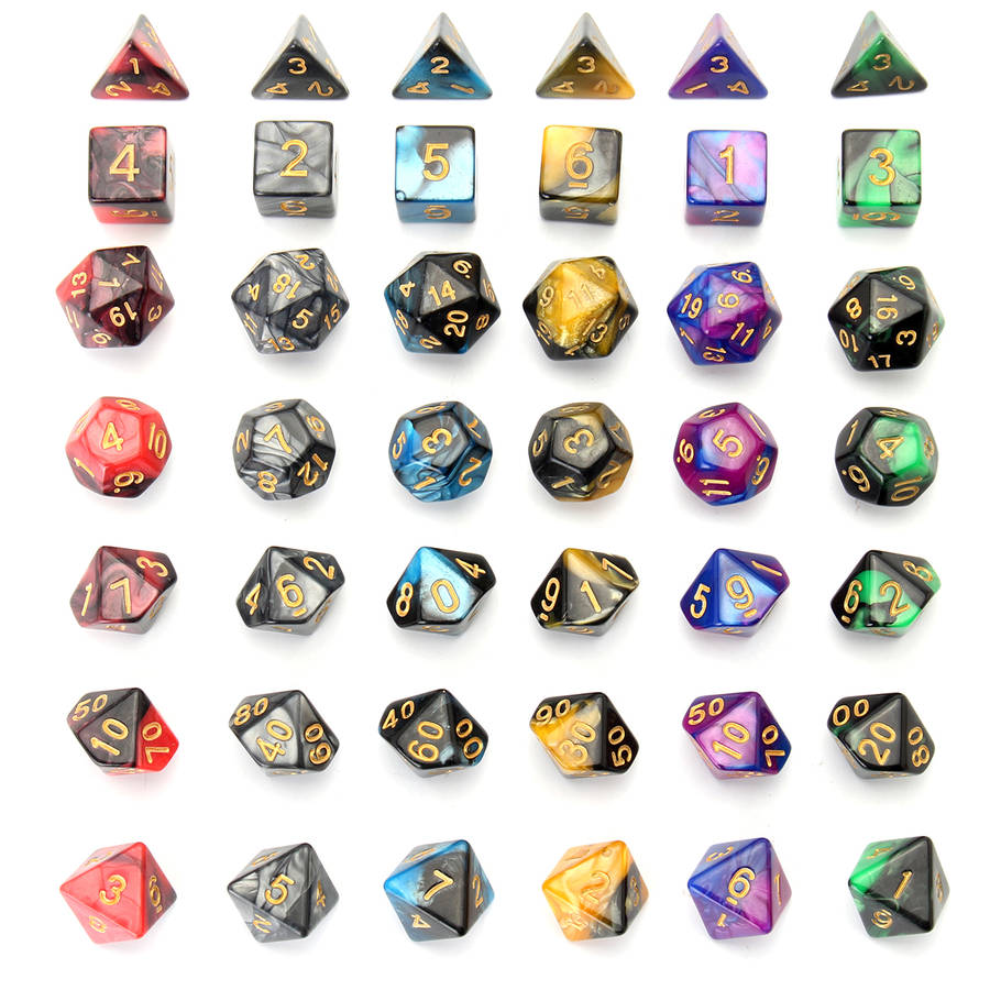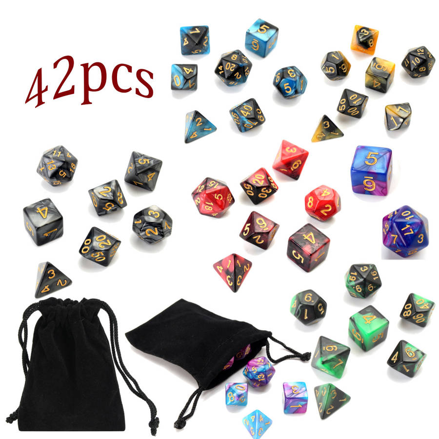 Features: - Quantity: Total 42 pcs of polyhedral dice(6 Set of 7-Die Dices) - Each 7-Die Dice Contains: 1 * d20, 1 * d12, 2 * d10 (1 percentage die), 1 * d8, 1 *d6, 1 * d4 dice - Made of Acrylic Materials Which is Durable and Hardwearing. Each Die with Large and Easy to Read Golden Numbers. - Great props for Table Games, Dungeons and Dragons, DND MTG RPG gaming,Perfect for various parties, teaching projects, etc. - Each set comes with a free flannel drawstring pouch to store your dice and you can distinguish the dice by bright colors.