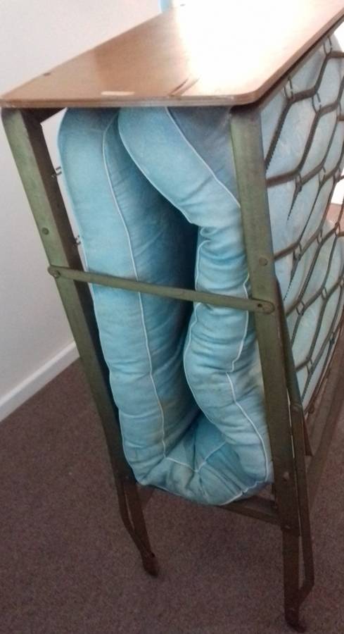 Foldable mattress folds up in the frame very neatly with headboard on the top.