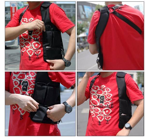 Features: An classy vest bag is needed to keep your materials safe from nasty thieves! This product brings to you an inspector anti theft shoulder bag, designed for safety and durability. Double-bag design, the pouch just accommodate the size of an iPhone4,the big bags can accommodate other electronic devices such as mp3 or second phone, it can also carry passports,notepad. Bottom of zipper tape can be put a few bills and some change! The shoulder sized handle can easily adjusted and easy to back up. It is hard tell the contents brought after you wear a coat, stealth and anti-theft feature.The back material is a breathable mesh, do not worry about the back will be hot for a long time. When use it, simply shoulder strap penetrate right arm. Wallet and mobile phone always in the underarm grip of the state due to the body's natural movements,so thieves will have no way for stealing. Specification: Overall size: 400 x 100 x 50mm Small bag size: 75 x 125mm Large bag size: 140 x 125mm Money-chip size: 80 x 210m Weight: 0.252kg Material: Steel / 400D anti-tear nylon