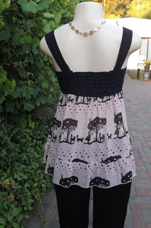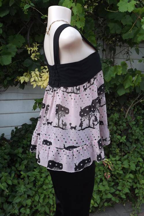Edgy but playful dull pink top size 32/8 with black pattern dots and shoulder straps.100% Wash&wear